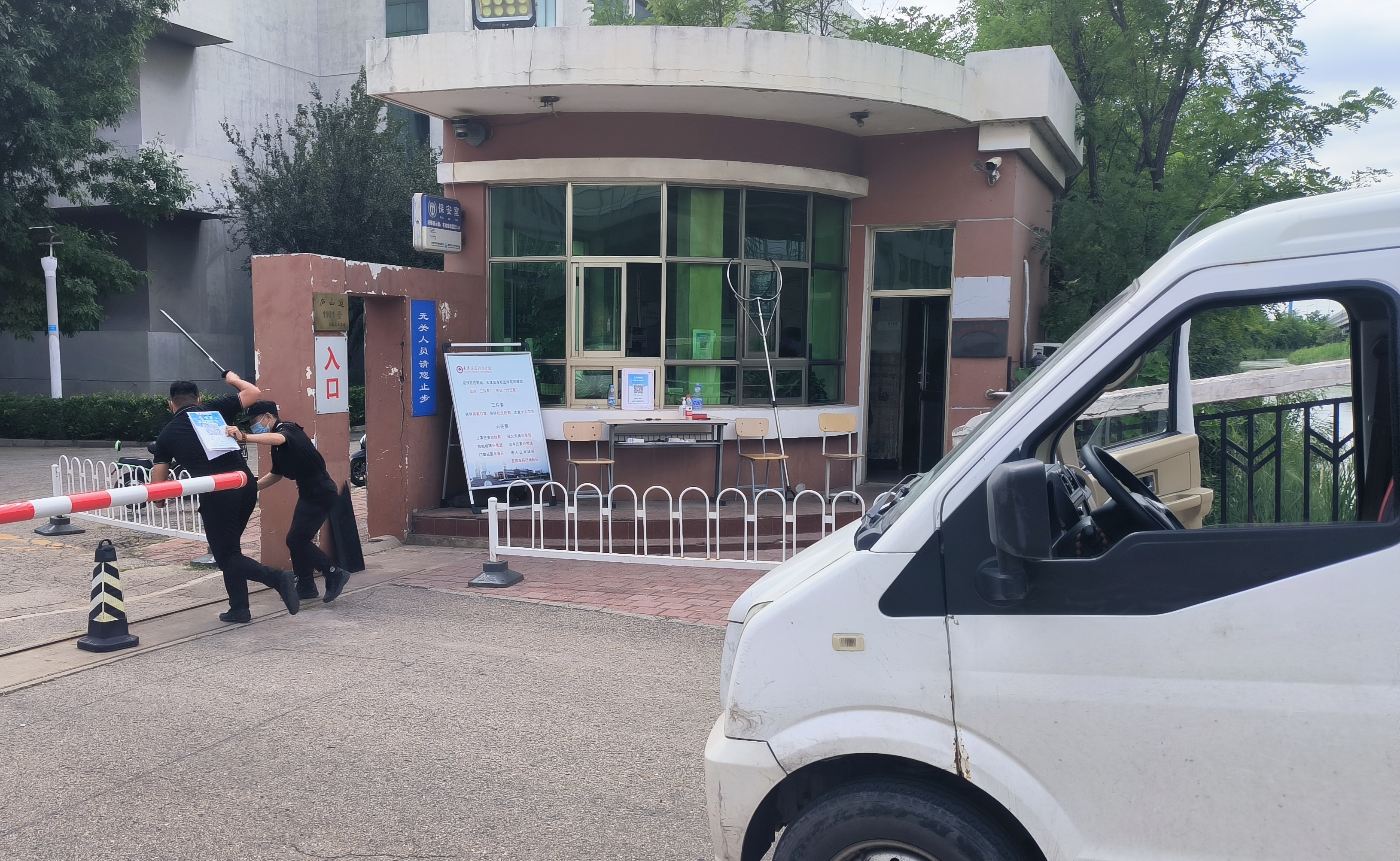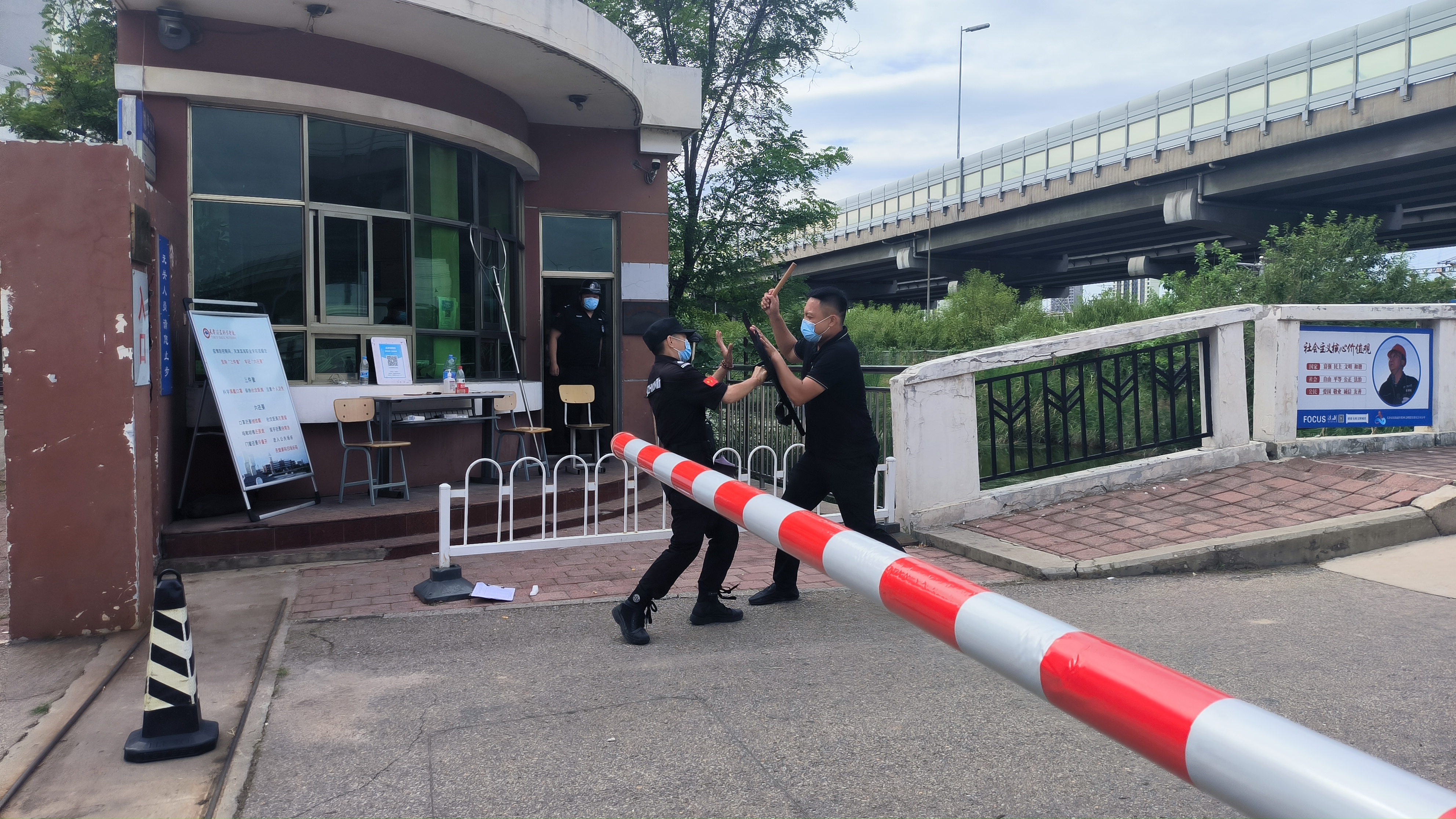 (3)现场模拟事发场景。一男子为寻仇以送货为由开车准备进入校园,当值门岗保安队员一如既往的走到校门口对来访人员进行敬礼登记测温。由于疫情防控尚未解除,学院对外来人员进入校园实行审批制度,未经审批的人员是禁止进入校园。来访人员未在审批名单内,保安人员告知其学院规定,未让其进入校园,并警告其离开学校范围。该男子不听劝告,并下车到副驾驶取出持械行凶器,继续往校内闯。保安继续与该男子沟通时,该男子突然对保安员进行威胁,挥舞铁棍。保安队员在劝阻无效并且遭受歹徒追打的情况下,快速呼叫支援。总指挥收到呼叫,第一时间启用一键报警装置。为防止歹徒更多同伙闯入,立即封锁校门,并用对讲机呼叫:“启动反恐预案。”反恐应急小组在收到指令后,立即穿戴好防护装备,并装备防暴器械,冲出应急室。歹徒在知晓增援人员赶至现场的情况下,仍然予以反抗,并向校内深处逃窜,反恐小组共同协作,采取强硬措施,当场将持械歹徒制服,并押送至北门岗。与此同时,通讯联络人员立即联络反恐防暴领导小组副组长,询问对歹徒的处置方式。后接上级领导指示,等待警察到达现场将歹徒带走。