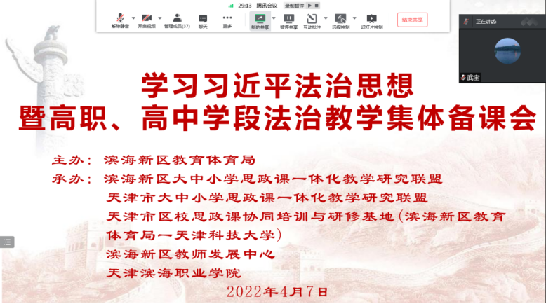 为进一步推动学习贯彻习近平法治思想走深走实,有效推动滨海新区大中小学思政课一体化教学螺旋式上升,滨海新区于2022年4月7日举办了学习习近平法治思想暨大学(高职)、高中学段法治教学线上集体备课会活动。来自滨海新区教师发展中心(含分中心)高中段思政课教研员、滨海新区高中(含职校)、大学(高职)学段的24所学校共200余名思政课教师参加,会议由天津滨海职业学院马克思主义学院书记、院长李玉梅主持。天津市大中小学思政课一体化教学研究联盟秘书长、天津科技大学马克思主义学院院长朱新华教授参会并讲话。