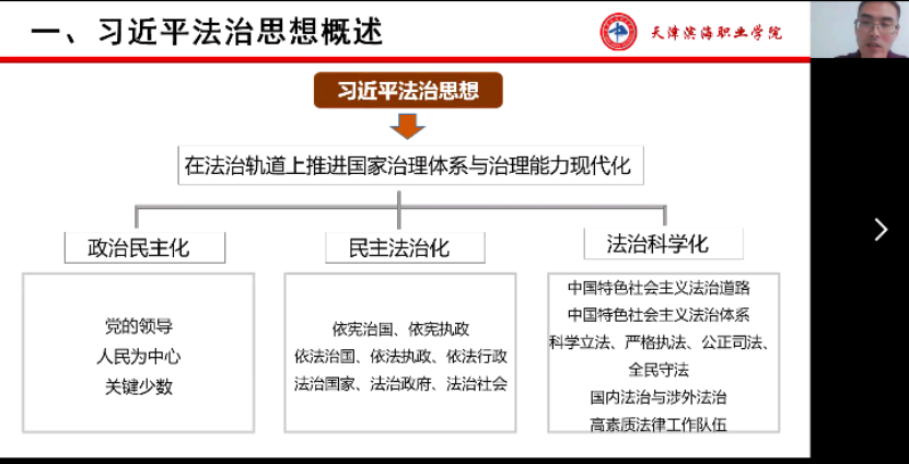 本次集体备课会由天津滨海职业学院马克思主义学院思想道德与法治教研室主任武奎老师主讲。武老师从习近平法治思想的提出、形成过程和主要内容讲起,给出高中学段《法律与生活》课程的备课思路与建议,并对第一单元内容进行了有效梳理。