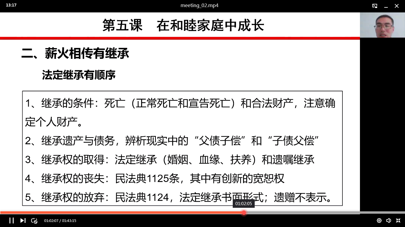 武奎老师今天主讲内容是高二法律与生活(第二单元)内容。第四课侵权责任与权利界限从侵权概念、构成条件、责任承担方式、诉讼时效、归责原则方面;第五课在和睦家庭中成长从家庭、家风、家教的构建,从对未成年人抚养教育保护及监护人顺序职责、老年人的赡养、监护及禁止行规定到继承等;第六课珍惜婚姻关系从社会发展角度谈爱情婚姻必要性及结婚离婚条件、禁止性条件等。武老师讲述概念准确、梳理法条细致全面,案例生动精彩。武老师讲述不仅是教材内容,还有拓展内容;不但有理论内容的讲解,还有教法的推荐以及案例的选取。