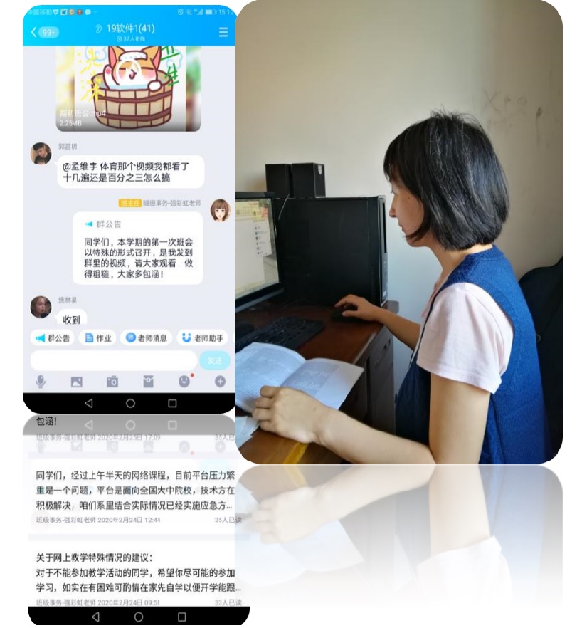 从疫情爆发至今,天津滨海职业学院信息工程系强彩虹、孙铭蔚、阚瑶、努尔夏提·吐逊江四位辅导员积极为班内学生开展思想教育工作,引导学生正确面对疫情期间的学习工作,并通过网络召开班会开展大学生的爱国主义教育和诚信教育: