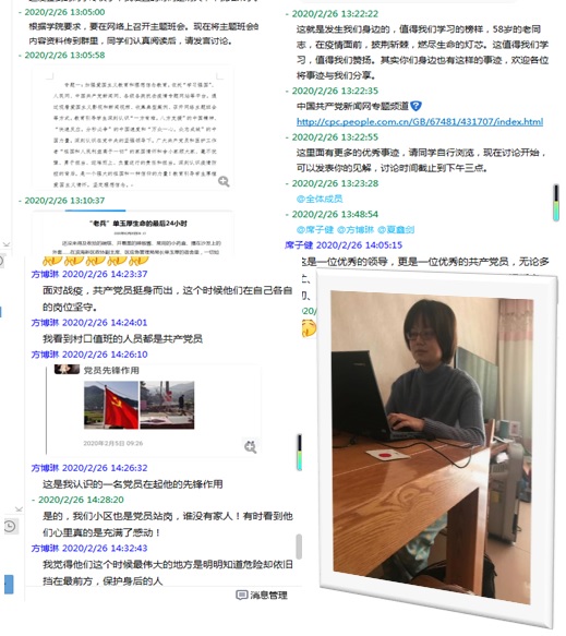 物联网班的方博琳同学在QQ群中发言:面对战疫,共产党员挺身而出,这个时候他们在自己各自的岗位坚守。我看到村口值班的人员都是共产党员。我觉得他们这个时候最伟大的地方是明明知道危险却依旧挡在最前方,保护身后的人。