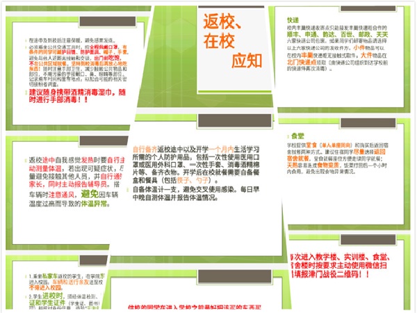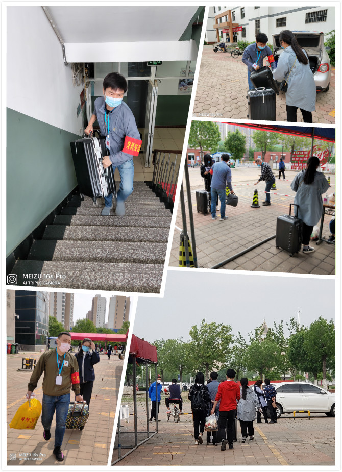 5月15日,学院迎来大一大二年级全体学生复课复学抵津返校。15日早7:30,信息工程系教师全员集合到岗,根据此前多次系部会议协商确定的方案,全体教师组成迎检组、应急处理组、流动帮扶组、宣发及备勤组以及党员先锋队,在校门、信息工程管理与服务实训基地、主教学楼、学生宿舍组成了一条信息工程系返校工作阵线。
