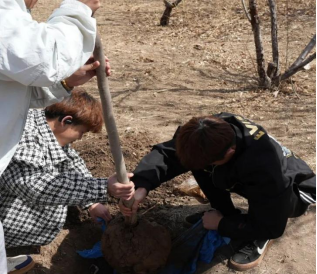本次活动在图书馆后侧树林种了寓意着事事如意的柿子树。植树的流程看似简单,但只有在真正进行实践时,才会发现这项活动并非如想象中简单:或是坑洞挖得不够深,或是难以确保树苗竖直站立,或是不确定浇下的水是否足够充分……活动现场,师生植树热情高涨,纷纷拿起铁锹,种下一棵棵柿子树。