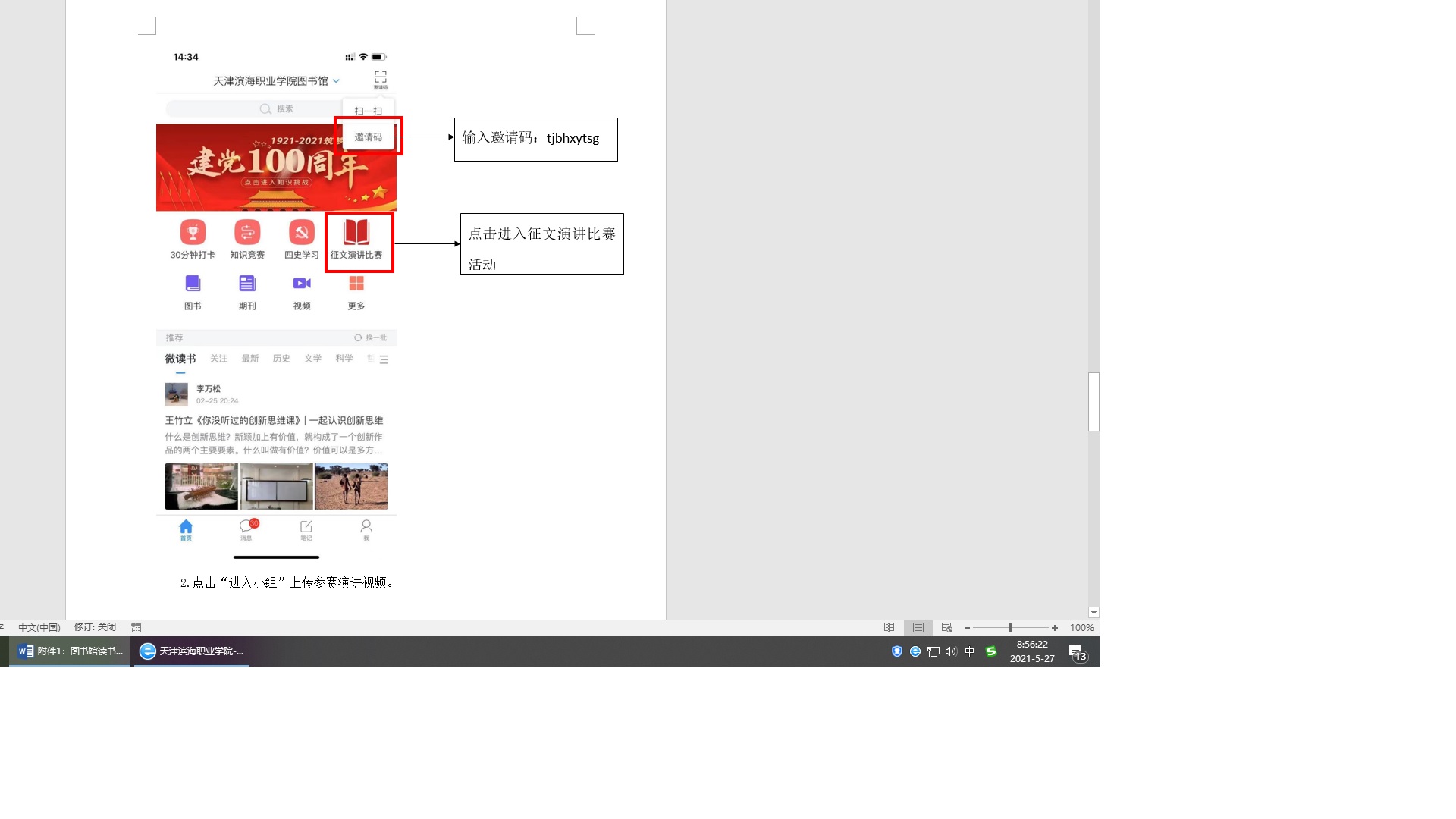 1.进入活动界面:在“学习通”首页右上角点击“邀请码”输入“tjbhxytsg”,进入图书馆主页面。在主页面点击“征文演讲比赛” 模块进入活动页面。