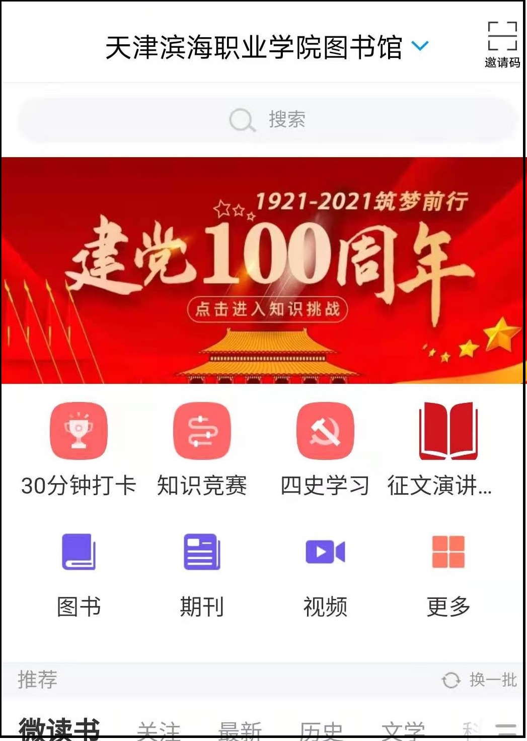 4月23日是第26个世界读书日。在庆祝建党百年之际,图书馆联合超星集团,应用“学习通”平台面向全体在校生开展读书月系列活动,“学习通”首页右上角点击输入邀请码“tjbhxytsg”,进入图书馆首页即可参与活动,期待你的到来。