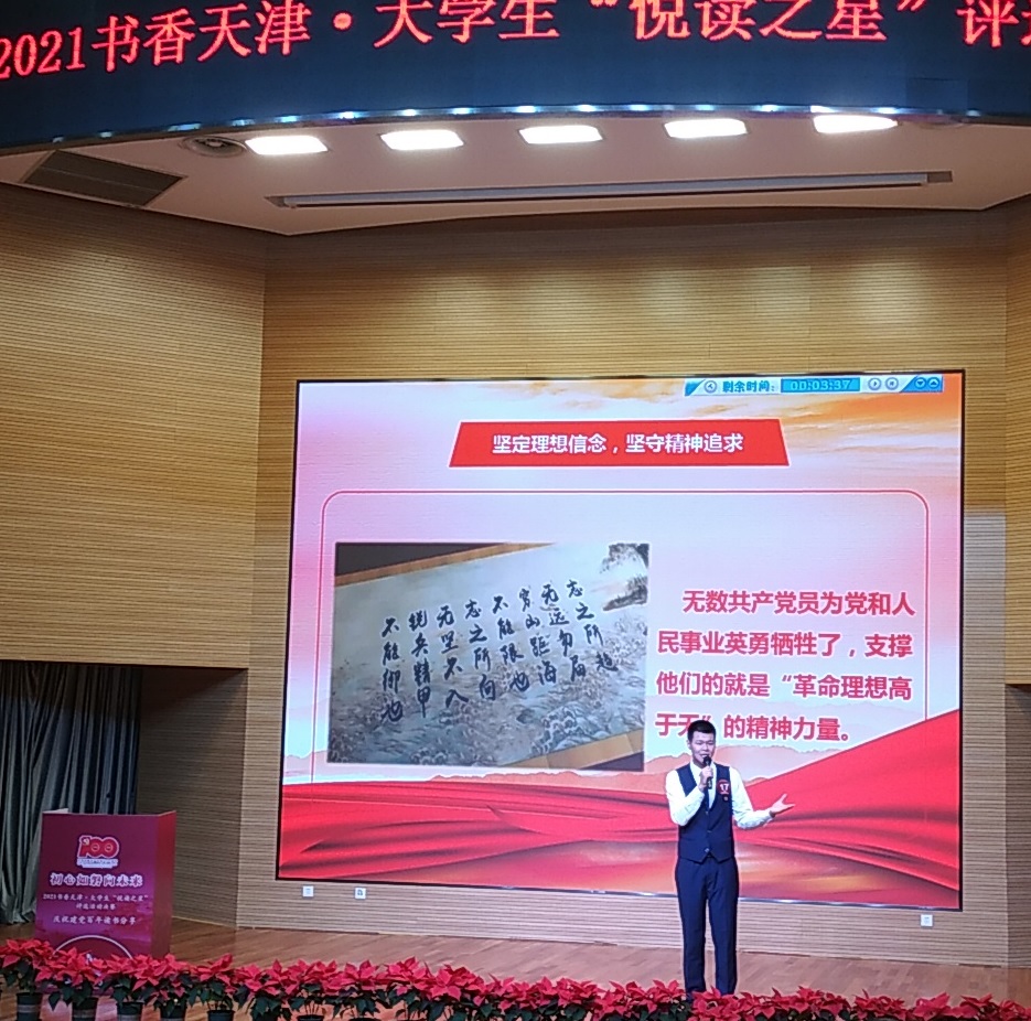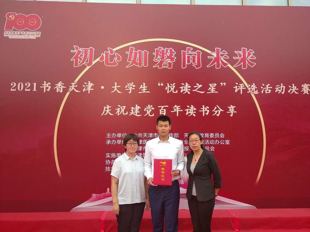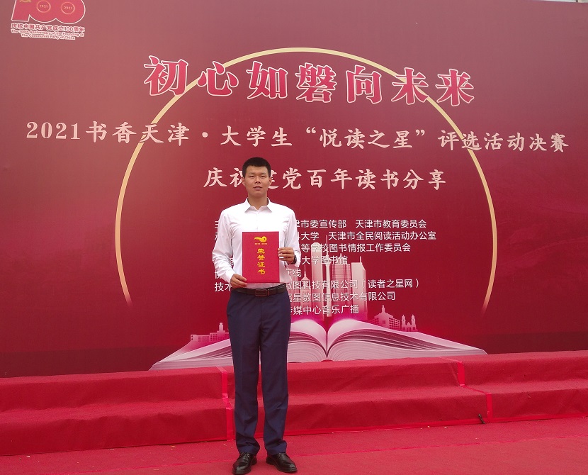 为引领当代大学生深入认识党的光辉历史,从历史中汲取新时代的智慧和力量,由市委宣传部、市教委联合主办的天津市2021年“初心如磐向未来”庆祝建党百年读书分享推荐活动暨2021书香天津·校园“悦读之星”总决赛,于6月20日在天津医科大学举行。来自全市本科高校、军事院校、独立院校和高职高专53所学校的选手参赛,经过激烈的角逐,新葡的京集团8814机电工程系王文博同学演讲的《坚定理想信念 走好新时代的长征路》荣获天津“悦读之星”二等奖的优异成绩。
