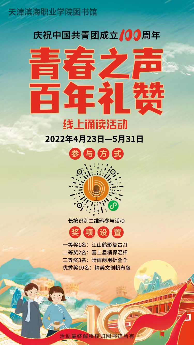 为迎接党的二十大胜利召开,庆祝中国共青团成立100周年,进一步学习领会习近平总书记关于青年学生成长的相关讲话精神,弘扬和培育以爱国主义为核心的民族精神,团结引领广大青年学生建功新时代、奋进新征程,提升历史责任感和使命感,展示蓬勃向上的精神风貌。图书馆特在读书月期间开展“青春之声 百年礼赞”线上活动,激发爱国热情,讴歌时代精神,砥砺奋发,笃行不怠,赓续前行,奋勇争先。具体活动内容及参与方式详见附件5“‘青春之声·百年礼赞’庆祝共青团成立100周年线上诵读活动方案”。 欢迎大家踊跃参加!