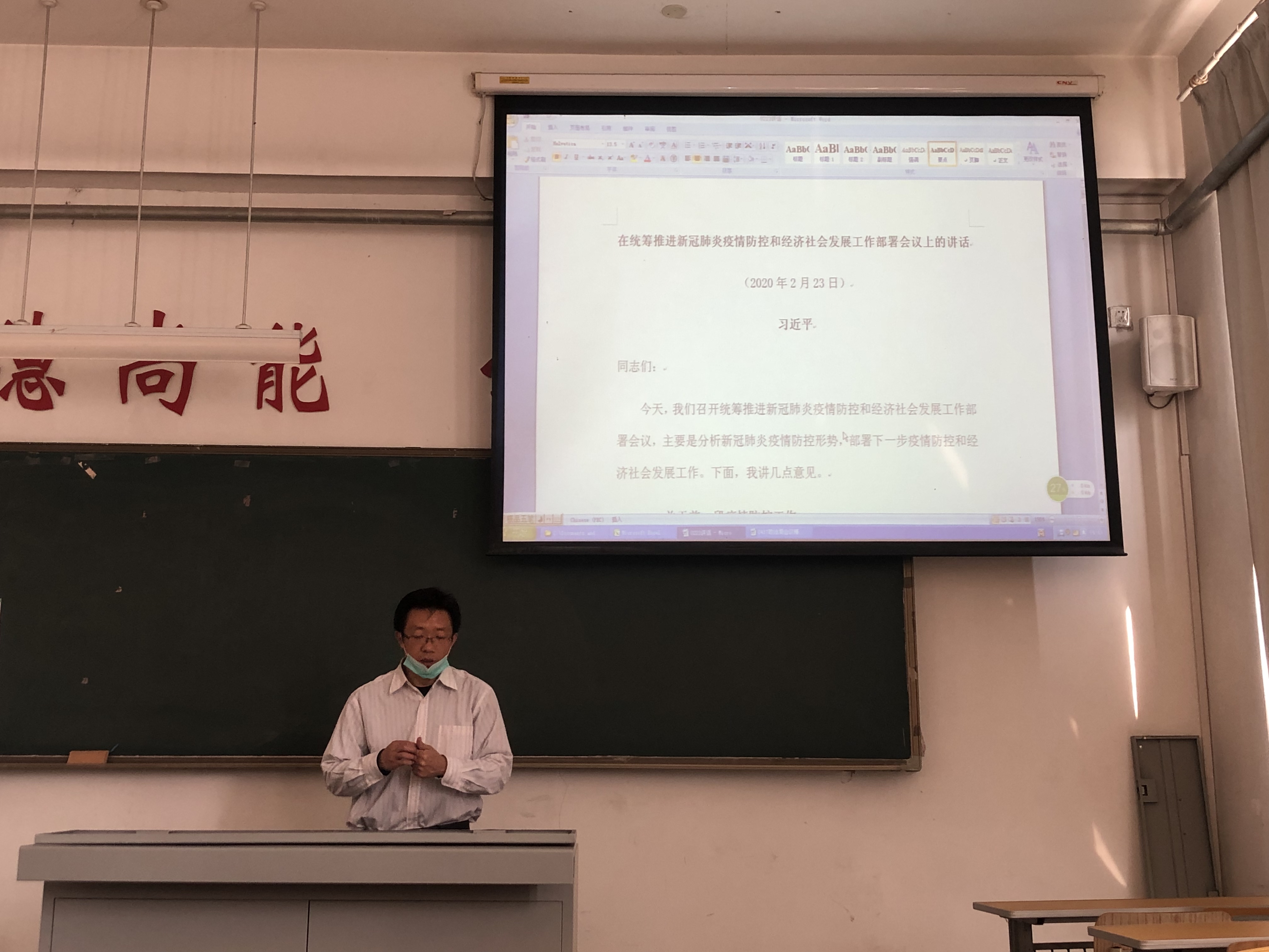 会议分为三项内容。徐公仁副书记带领全体教师学习了《习近平总书记在统筹推进新冠肺炎疫情防控和经济社会发展工作部署会议上的讲话》《中共中央政治局4月17日会议精神》等相关文件;通过文件的学习,要求全体教师进一步提高思想认识,严格落实中央精神和相关要求;结合学院工作,认真做好学院疫情防控和开学复课等各项工作,进一步加强做好疫情防控和复课开学统筹工作,确保毕业答辩工作顺利开展。徐公仁副书记部署了毕业生答辩工作。向全体教师介绍了学院及我系答辩的总体情况,并就答辩期间的工作安排做了详细说明和部署,要求全体教师要在思想上重视,行动上积极配合。会后,辅导员施苓艳进行了消杀工作的培训。结合系部实际,施老师详细介绍了消杀场所、消杀部位、消杀方式以及配置浓度等内容,随后对消杀工作进行了现场示范。最后,