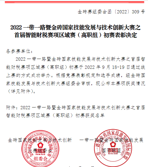 喜报:新葡的京集团8814会计专业学生获得2022“一带一路”金砖国家技能发展与技术创新大赛智能财税赛项全国选拔赛二等奖