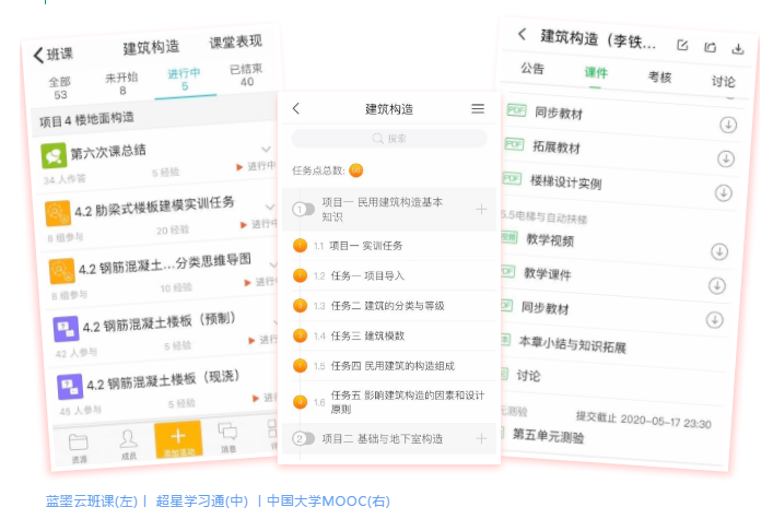 在开学前,我经过精心调研反复测试各种在线教学软件和平台,并紧密结合高职学生的特点与《建筑构造》课程的要求,为取得在线教学的最佳效果,最终确定使用超星学习通进行课前预习、蓝墨云班课进行课堂活动、中国大学Mooc进行课后测试以及穿插使用了QQ软件,充分发挥了每款软件和平台的特长。我的具体操作是这样的:
