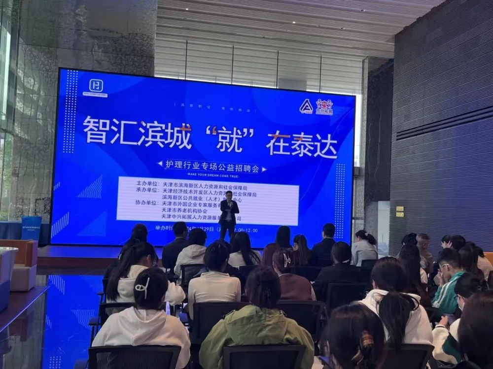 本次招聘会是天津市滨海新区人力资源和社会保障局为深入贯彻党的二十大精神,落实国家、天津市以及滨海新区、经开区稳就业决策部署,进一步推进提升就业服务质量工程,促进高质量充分就业,现面向滨海新区重点企业开展的“智汇滨城 ‘就’在泰达”——护理行业专场公益招聘活动。活动由天津经济技术开发区人力资源和社会保障局、滨海新区公共就业(人才)服务中心承办,天津市外国企业专家服务有限公司、天津市养老机构协会协办。